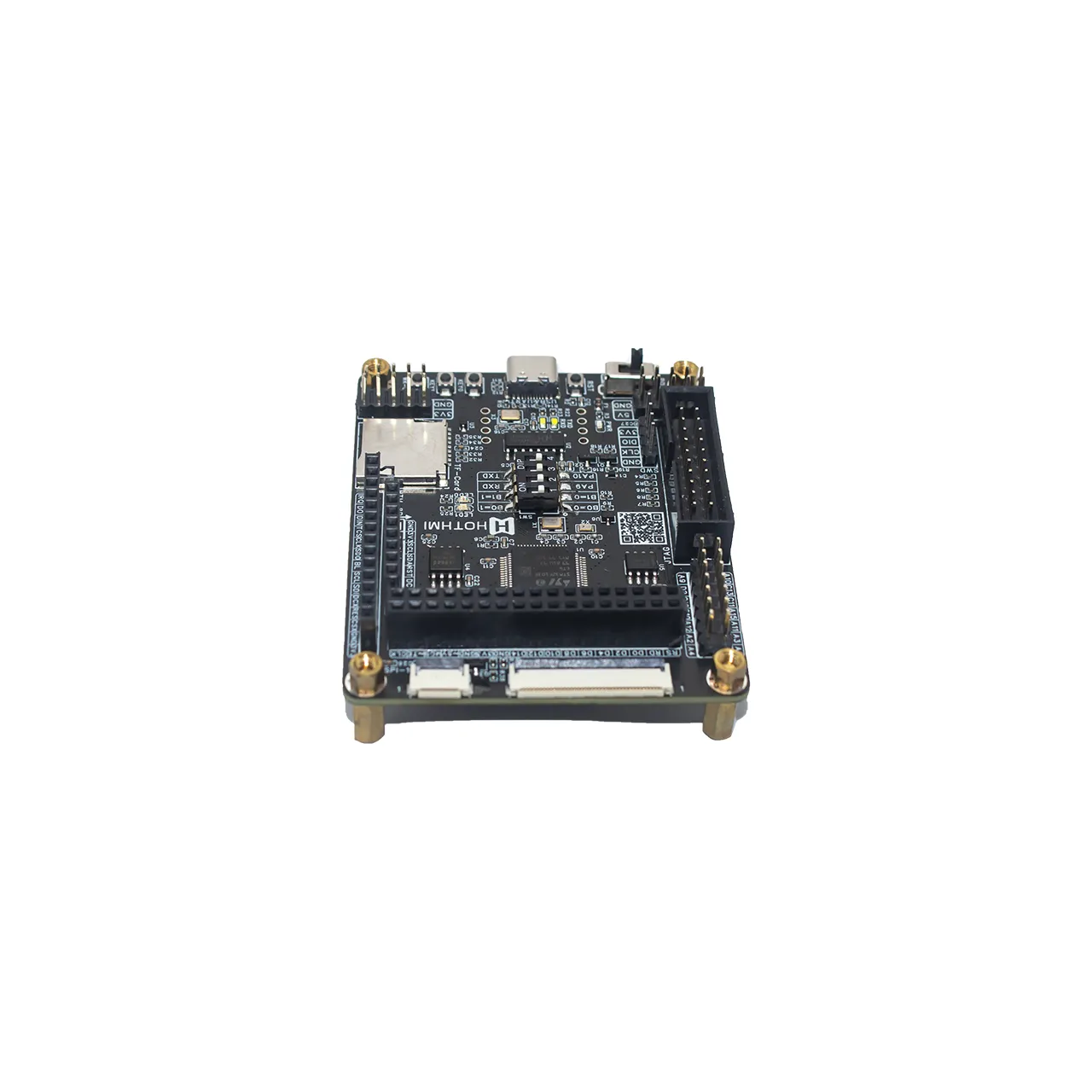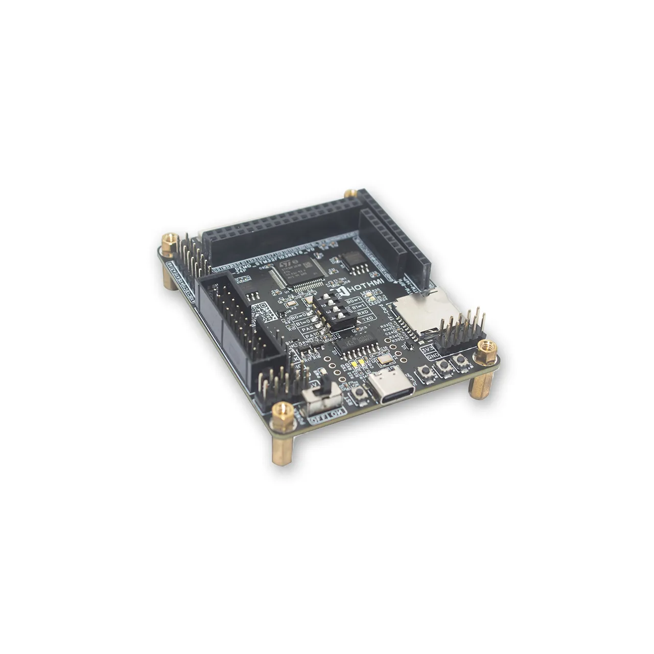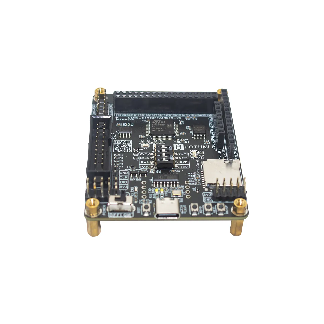 DEMO_STM32F103RET6开发板搭载原装STM32F103RET6芯片,基于ARM Cortex-M3内核架构,工作 主频可达72MHz,其配备512KB FLASH(程序存储)与64KB SRAM(数据运行),支持Thumb-2指令集 ,兼顾代码执行效率与存储容量,能满足中复杂度嵌入式程序的开发需求。本开发板适配多个显示 屏接口,且与我司大部分采用 MCU 接口和 SPI 接口的显示屏及显示模块相兼容,方便用户即插即 用,提高开发效率。DEMO_STM32F103RET6开发板硬件设计特点包括: 1)引出多种显示屏接口,包括:HTM-34P,HTM-8P,HTM-14P,SPI-10P和MCU-40P。此外,开发板背 面设置了电阻跳选,用户可根据实际MCU显示屏接口定义自行更改电阻跳选配置。 2)USB Type-C接口正反插兼容设计。借助USB-A转Type-C数据线的特性,通过正反插数据线可实 现不同功能,单个USB接口既支持串口一键下载功能,又保留了单片机的USB设备通信功能。 3)存储资源丰富。主控芯片自带512KB FLASH空间,外扩了16MB FLASH芯片并预留了SD卡座,满 足大数据存储需求。 4)交互资源丰富。板载了4个按键(包括一个RESET复位按键)和5个LED灯(包括一个PWR电源指 示灯),可对相关的引脚进行配置,以实现交互开发。 5)程序更新方式多样。开发板提供了JTAG接口,SWD接口和串口一键下载接口,可自行选择任一 接口进行程序更新,自由度高。 6)便于开发使用。选用拨码开关进行BOOT选择和串口选择,摒弃了传统的“排针+跳线帽”的跳 选设计,无需拔插跳线帽便可切换选择,使用更便捷。此外,各接口均通过丝印清晰标注,使用 时一目了然;接口布局设计合理,便于操作;充分规划板载资源,实现高效利用。